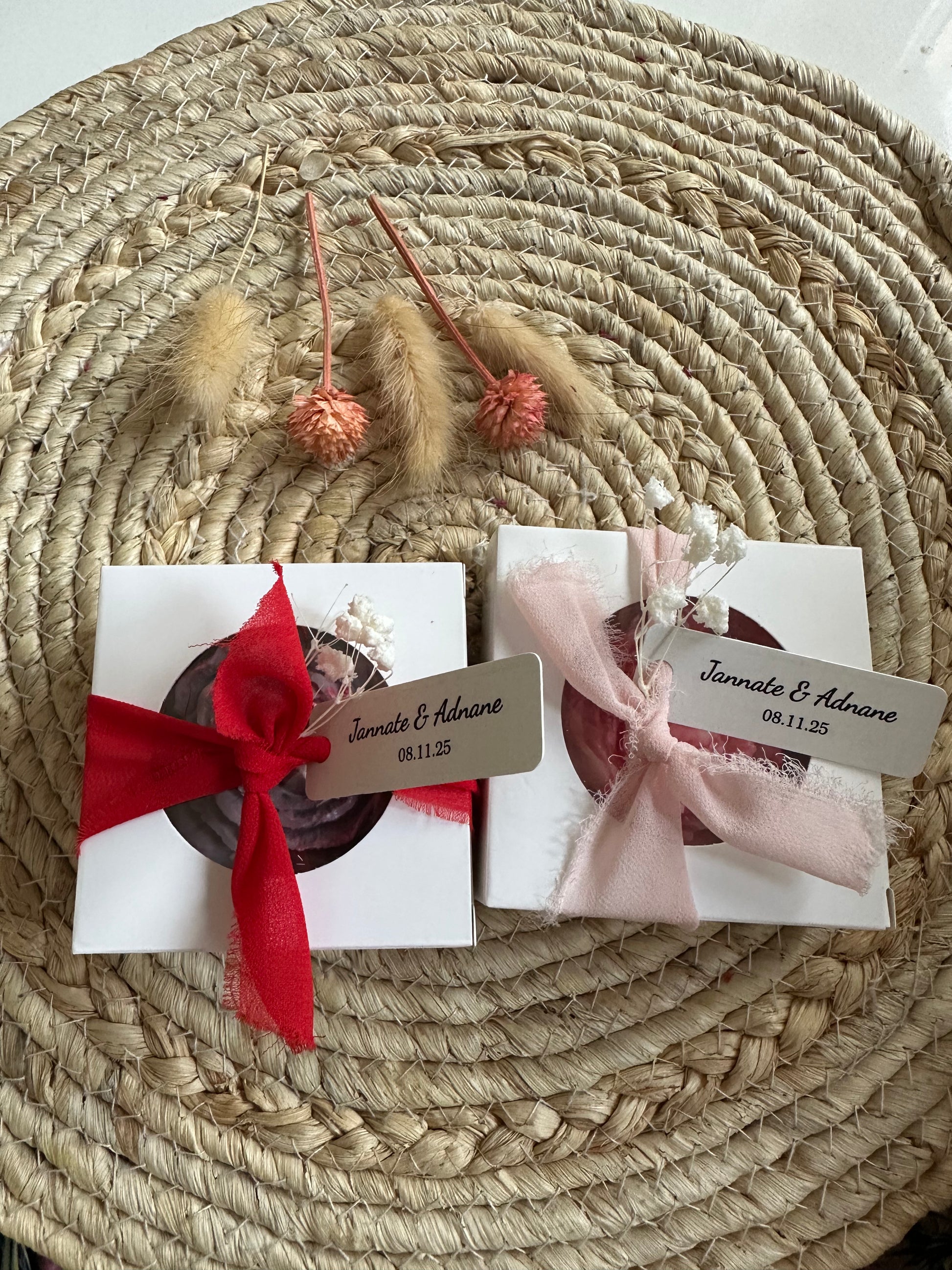 Pour tous vos événements – mariage, hlel, anniversaire – émerveillez vos invités avec une boîte de bougie en forme de fleur, personnalisée avec vos prénoms. Un cadeau unique, élégant et plein de délicatesse, qui laissera un souvenir précieux de votre journée.